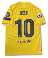 FCバルセロナの2020-21シーズンのセンイェーラユニフォーム(カタルーニャ旗)のチャンピオンズリーグ(CL)仕様、10番メッシ。リーガ仕様のユニフォームのパッチを外しCLスターボール、リスペクトパッチ、5回優勝カップパッチ、10番メッシの選手支給用マーキングを装着しています。